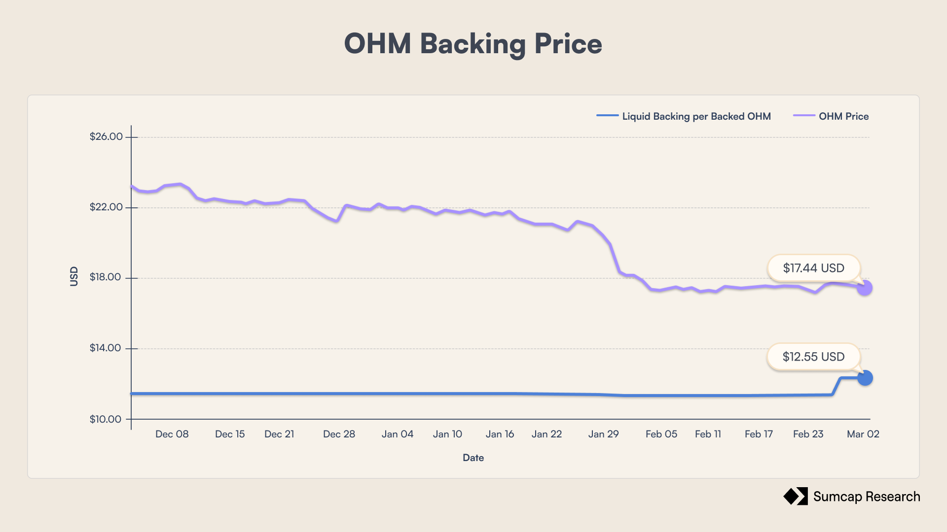 The liquid backing per $OHM price is the dollar amount of stablecoins, volatile assets and protocol-owned liquidity in the treasury, excluding $OHM. It serves as the fundamental solvency guarantee, as the OLTV is always set at a safe discount relative to the actual backing, ensuring the protocol remains solvent even if borrowers default.