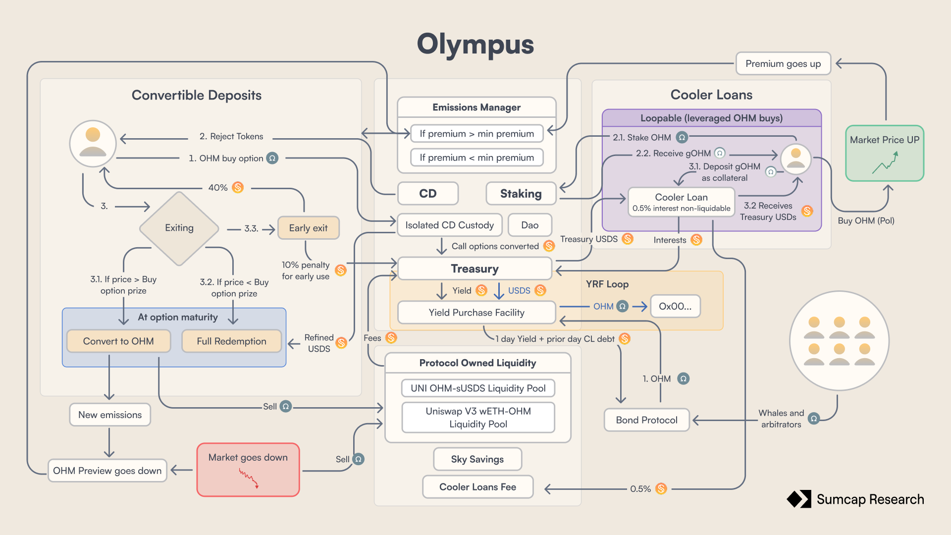 The system performs very differently depending on which regime $OHM sits in. When the premium is high, every mechanism reinforces the others and the flywheel compounds. When premium is low, the protocol runs almost entirely on savings yield routed through the YRF and the flywheel slows considerably. Olympus's long-term thesis depends quite a bit on the belief that these quiet periods are temporary.