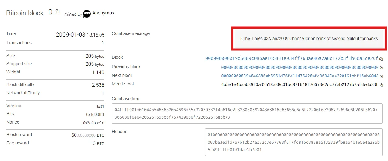 Three months after, on January 3rd 2009, the first Bitcoin block was mined, embedding a single headline: “Chancellor on brink of second bailout for banks.”