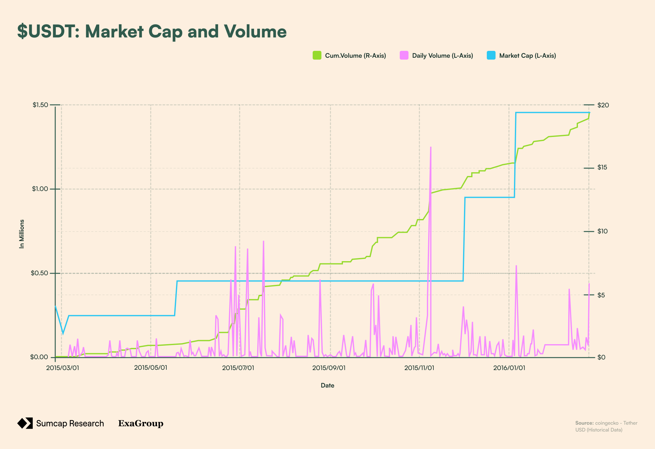 But, just four months later, in November 2014, Tether launched USDT - offering a simpler (fiat-backed) alternative where each token was redeemable 1:1 for U.S. dollars held in custody. USDT didn’t require overcollateralization or complex algorithms, and this simplicity is what allowed it to capture over $19.3M in volume & $1.45M in market cap in just one year.