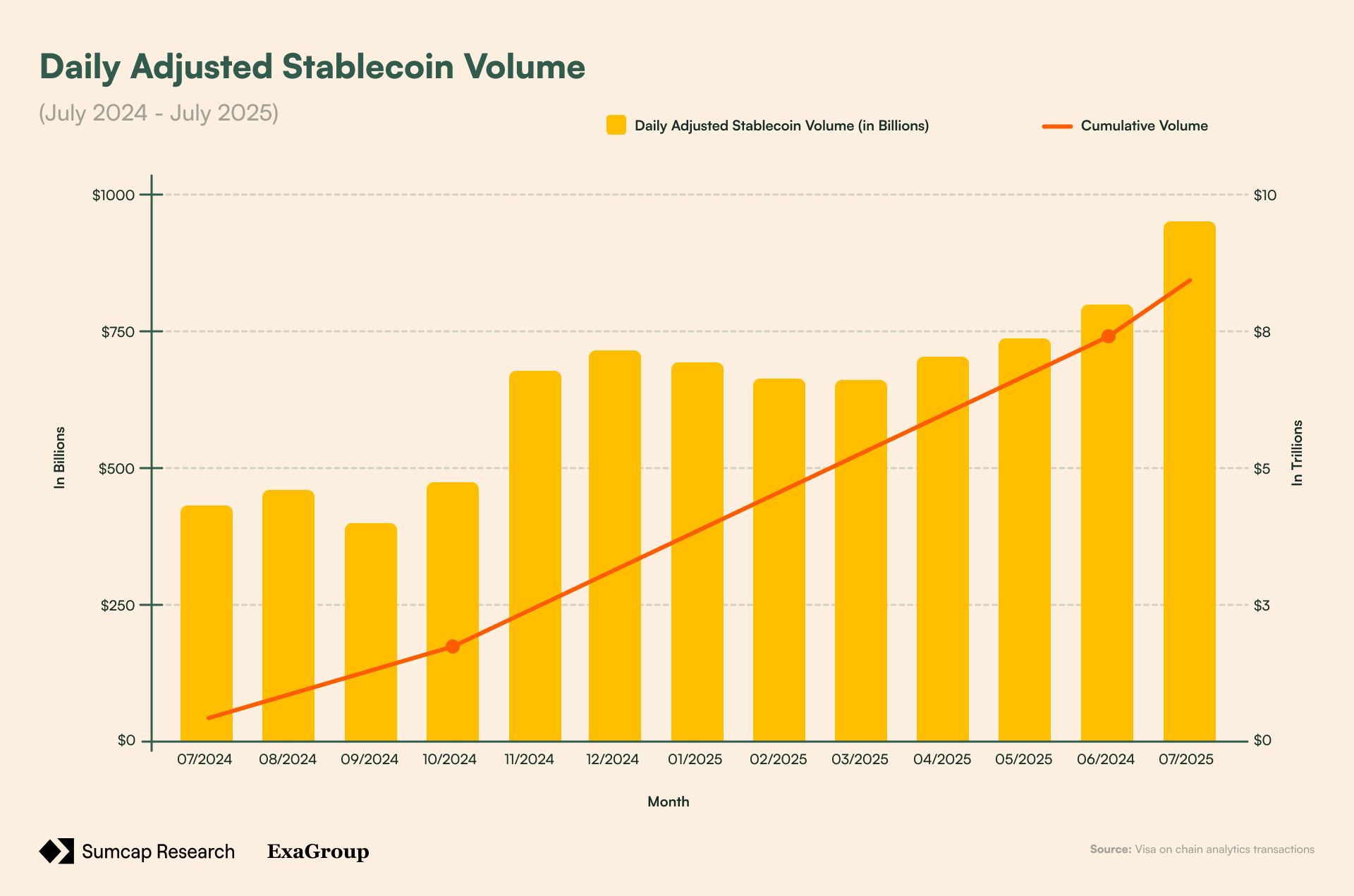 Furthermore, the U.S. Genius Act, signed on July 18th 2025, recognises stables as formal payment instruments, putting them on par with other regulated financial rails like debit card networks, ACH transfers, and wire systems.