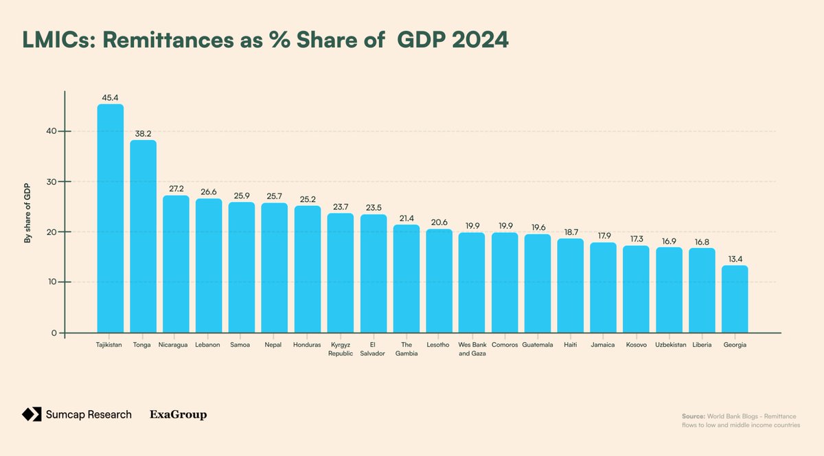 These cross-border payments (or “remittances”) play a crucial role in supporting the economies of low & middle income countries (LMICs) - and, for some of them, even amount to half of their gross domestic product (GDP).