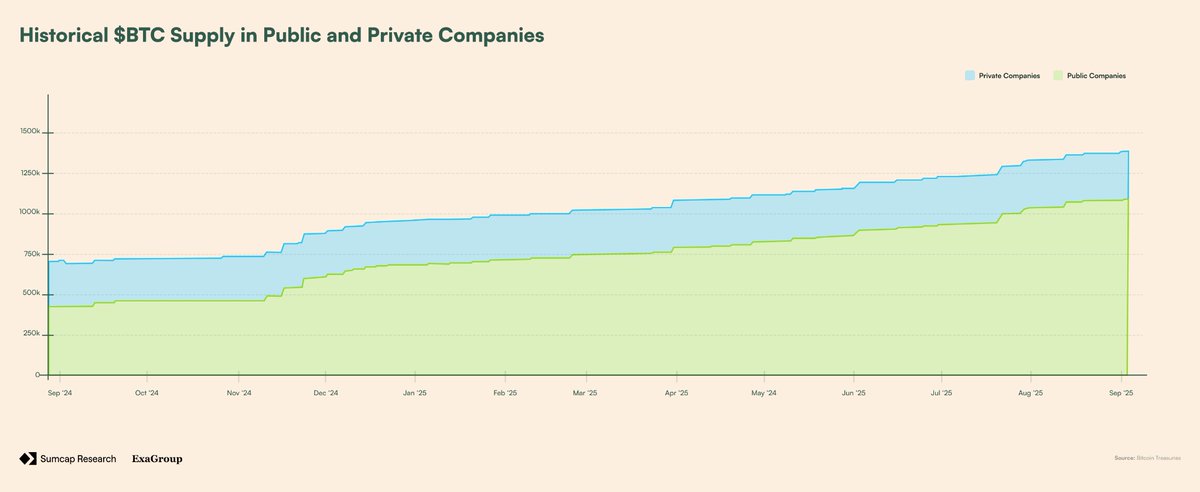 Institutional and corporate adoption is catching on, with public and private companies now holding a combined ~1.38M BTC. That’s a stark difference compared to that start of the year where these same entities held only 547k BTC in custody.