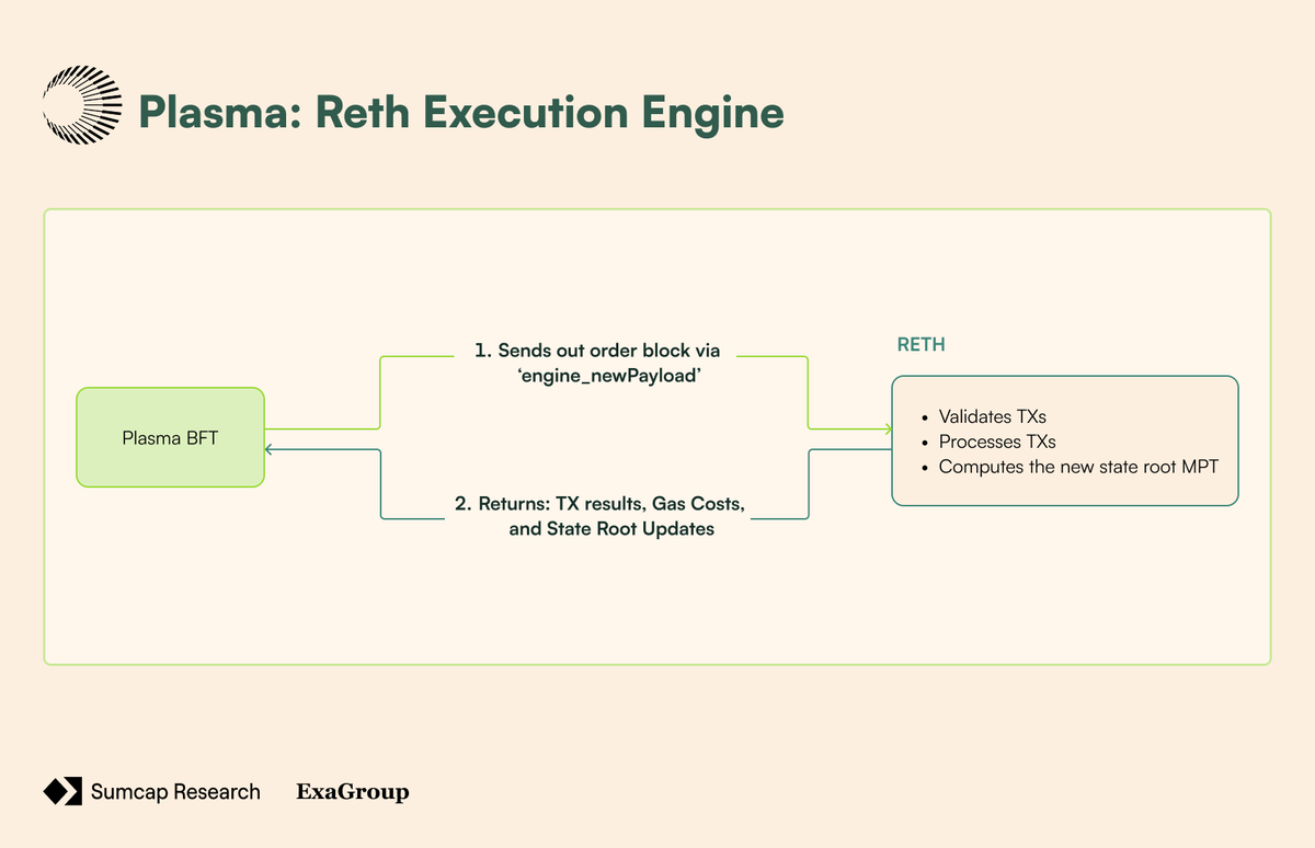 Plasma's execution layer is built on Reth, a modern Ethereum client written in Rust that manages: state transitions, transaction processing, and EVM operations with complete EVM compatibility.