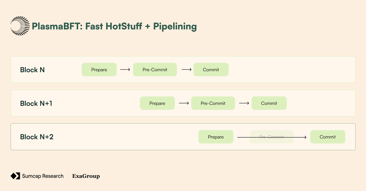 While validators are in the commit phase for block N, they can already be in the prepare phase for block N+1. The next block doesn’t have to wait for the previous block to fully finalize before starting its voting process.