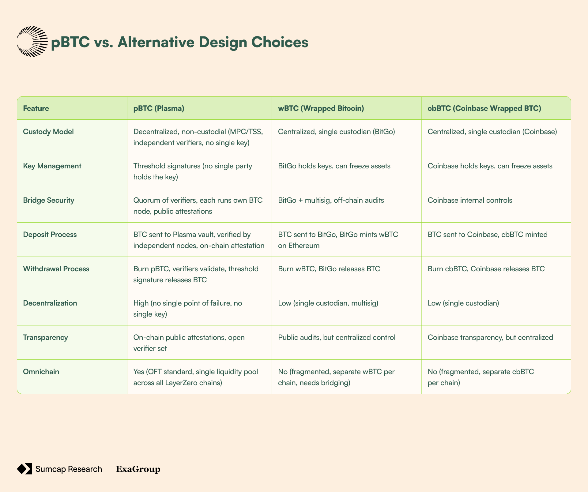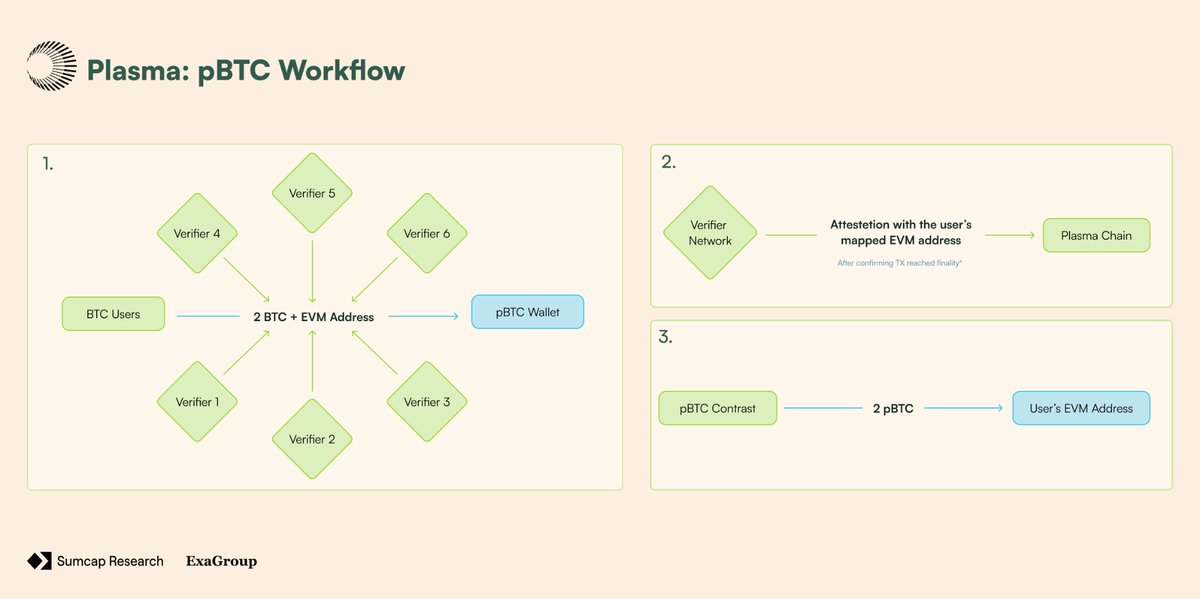 Plasma’s native Bitcoin bridge changes this. Instead of custody, it’s powered by a network of independent verifiers that each run their own Bitcoin node. No single party controls the vault, and for BTC to move in or out, a quorum of verifiers must collectively sign off using threshold signatures (MPC/TSS) - meaning no individual ever holds the keys.