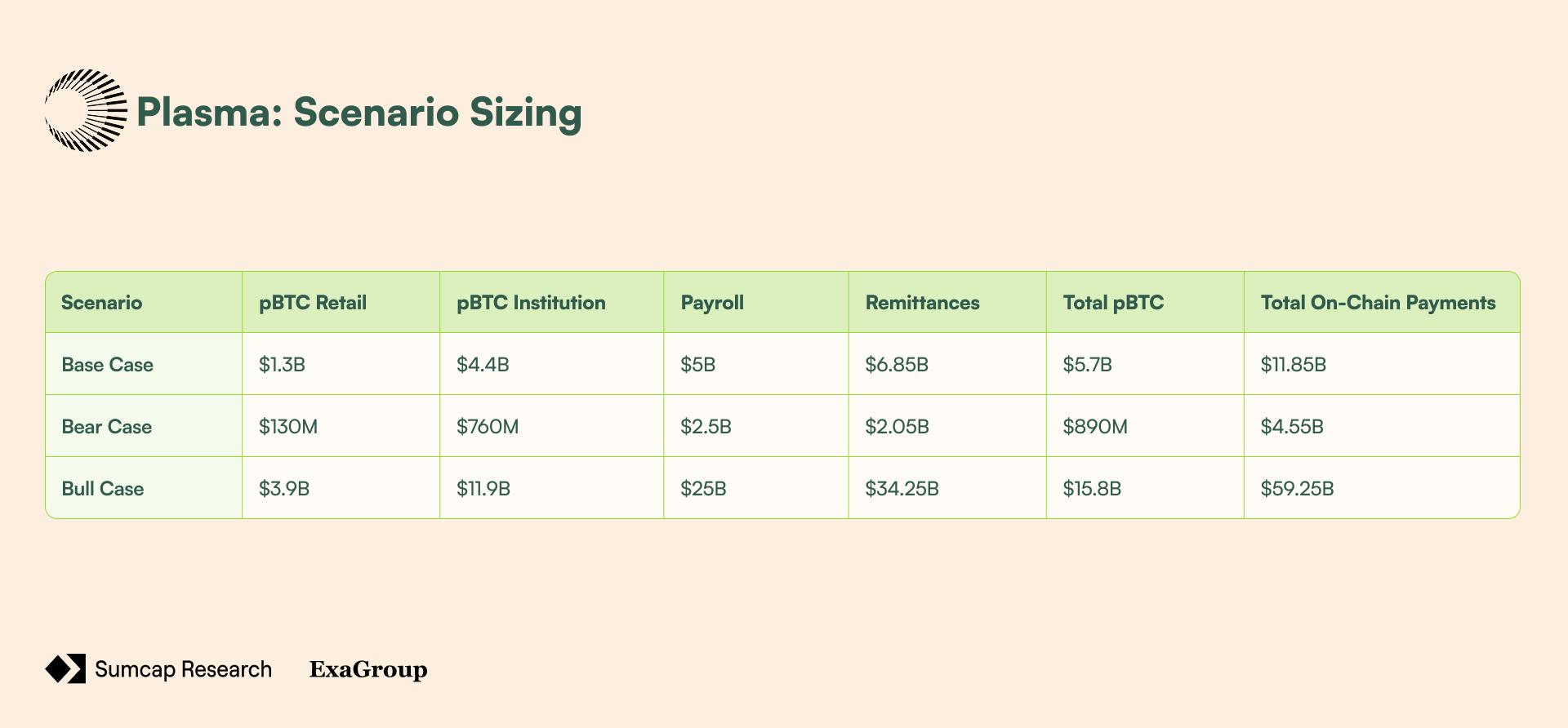 Total pBTC capture: ~146k BTC ($15.8B) - For on-chain payments, a 5% remittance adoption ($34.25B) as crypto becomes mainstream in emerging markets with government support and infrastructure improvements, alongside 0.05% payroll adoption ($25B) from progressive enterprises embracing crypto-native operations.